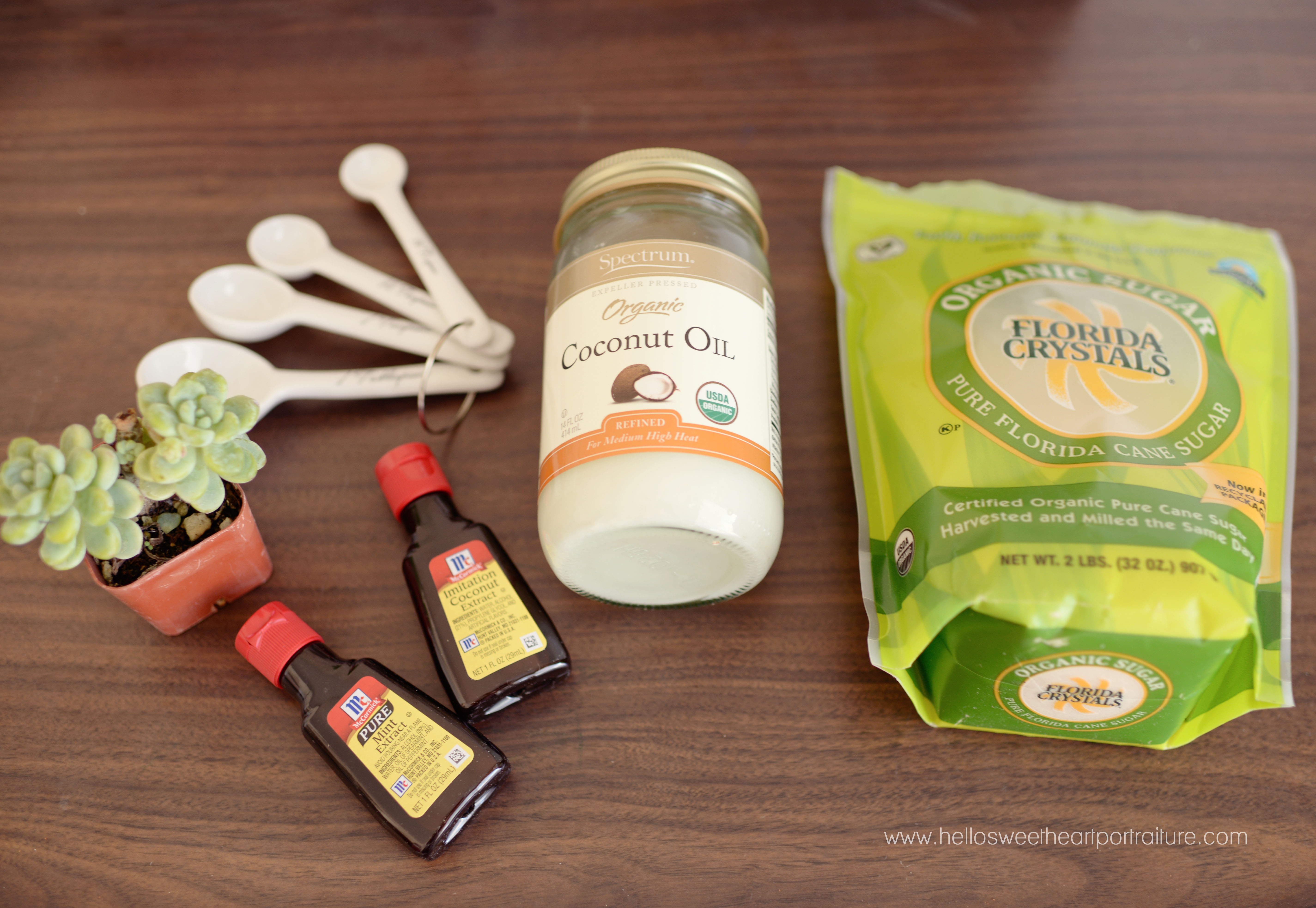Mix equal parts sugar & coconut oil in a small bowl. Continue to add sugar until a thick, pasty consistency is reached. Then add just a splash of each extract. About a half teaspoon of each is plenty.